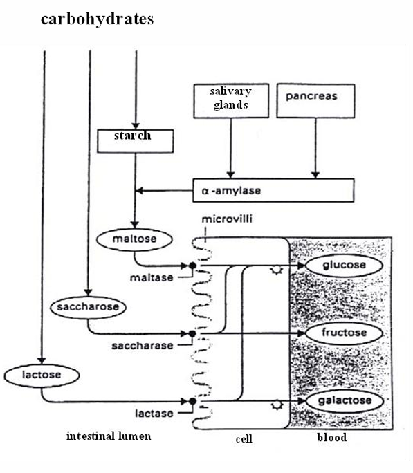 dissacharides → monosacharides (glucose, fructose, galactose)