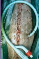 Tx: ventral midline incision, ID defect, repair, lavage, drains, catheter