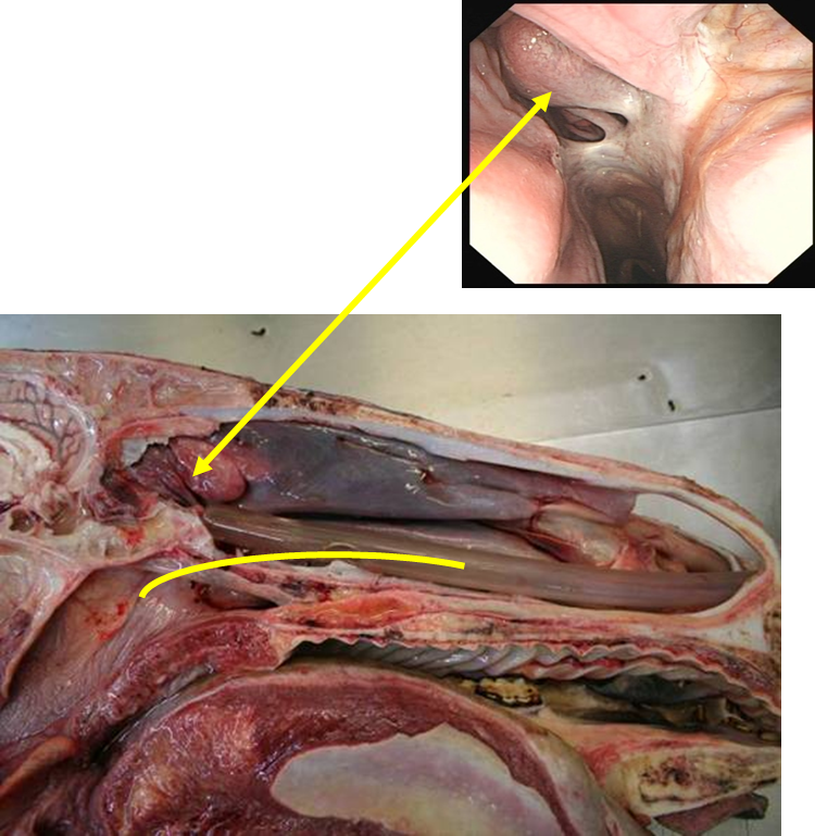 Dx —> fluttering sound at exercise (ddx laryngeal/ soft palate disorders) temporary sutures