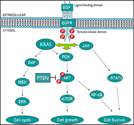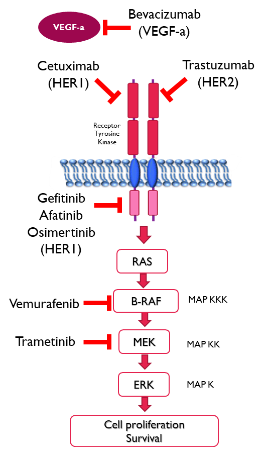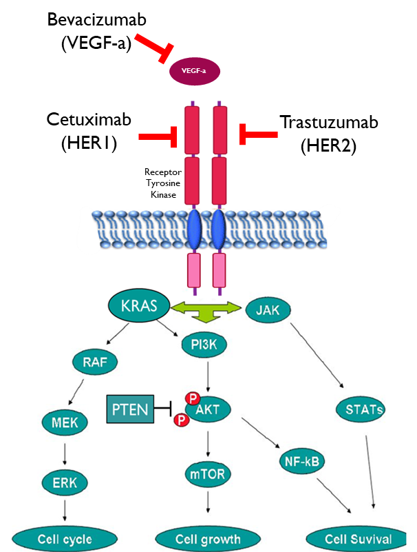 Biologics are used to interfere with the ligand binding to the extracellular domain of receptors tyrosine kinases. Small molecule inhibitors are designed to target the kinase domain of the receptors or intracellular kinases.