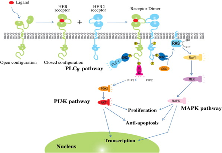 HER2 is a member of the EGFR family and can forms a dimer with other EGFRs. Overexpression of this protein is found in a percentage of breast cancer and also in some gastric cancers.