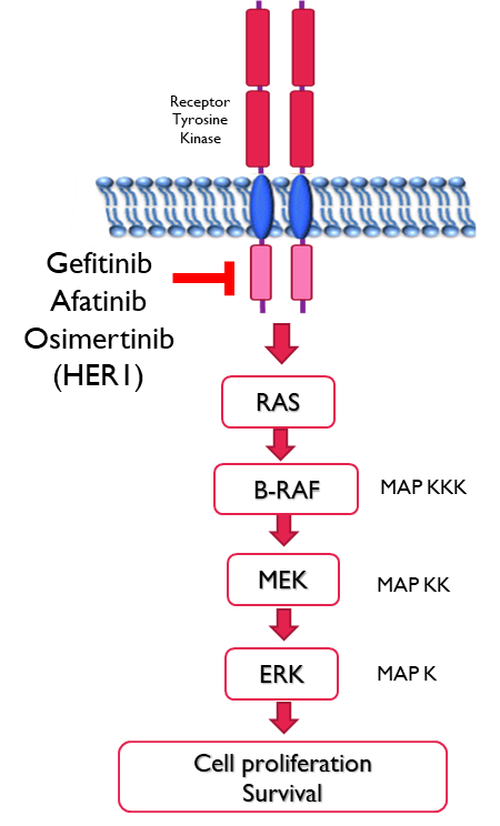 •Gefitinib - 1st generation reversible binding to wildtype and mutated receptors inhibiting phosphorylation