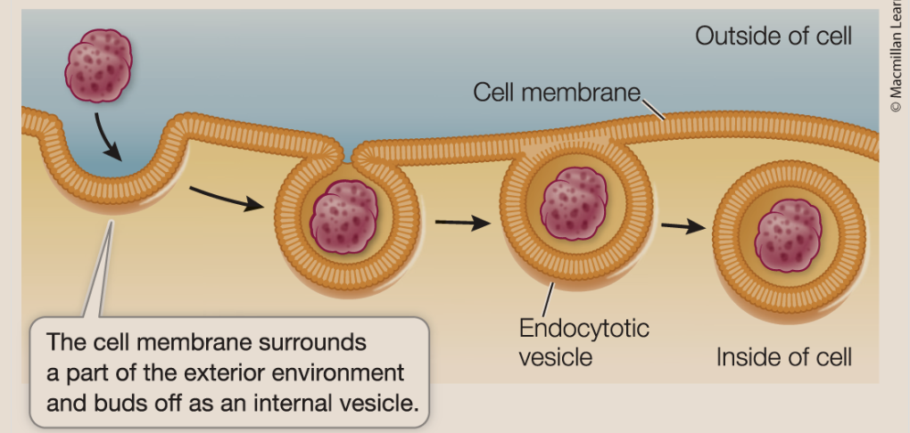 3 types: phagocytosis, pinocytosis, and receptor mediated endocytosis