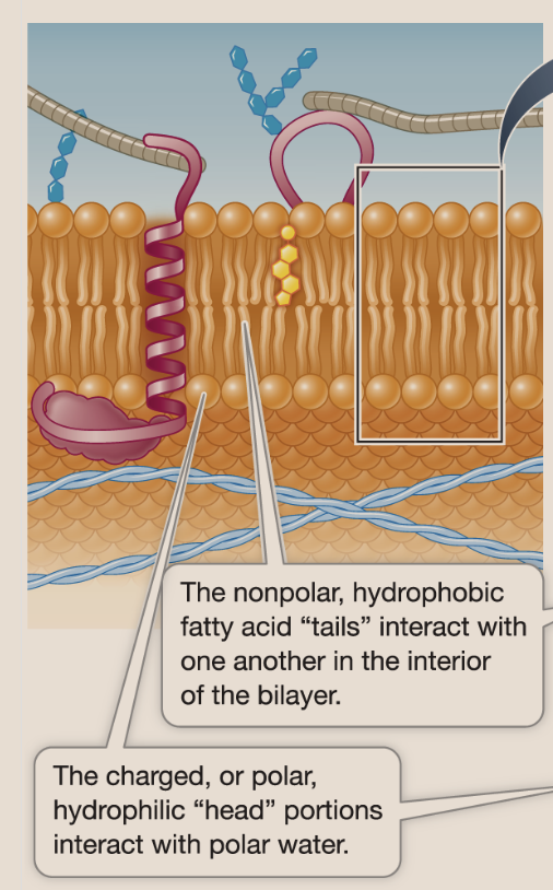 The primary structural components of cell membranes consist of a hydrophilic head and hydrophobic tails. Heads are the external portion of the membrane, while the nonpolar fatty acid tails make up the middle.