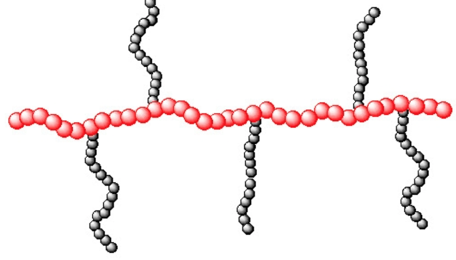 How would you best describe the structure of this polymer? (Assume the different colored spheres represent different monomer chemistries.)