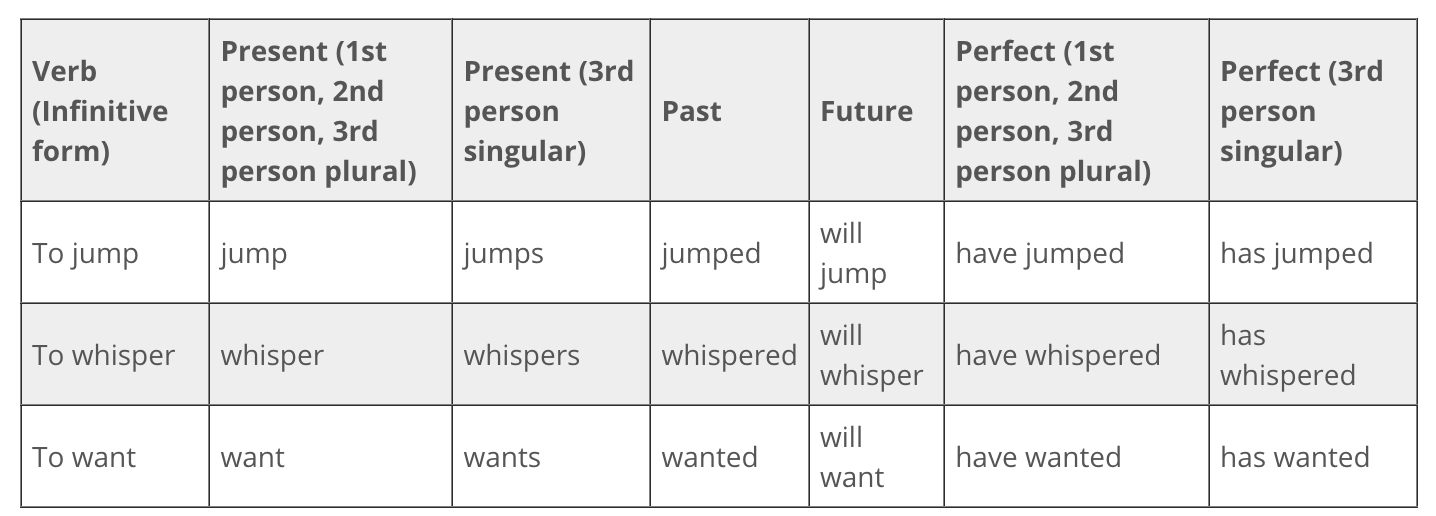are different variations of a verb that convey tense, mood, voice, or aspect, such as the base form, past tense, and past participle.