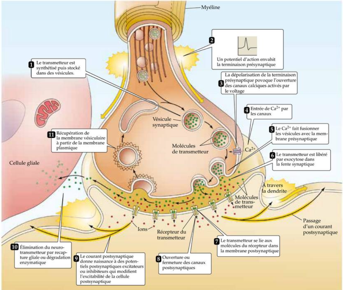 Fin du signal : recapture et/ou dégradation des neurotransmetteurs.