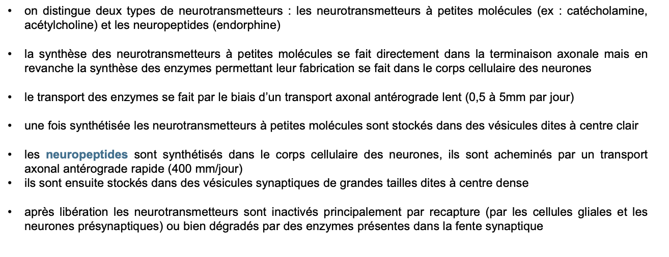Petites molécules : synthÚse dans la terminaison axonale ; les enzymes nécessaires sont synthétisées dans le soma.