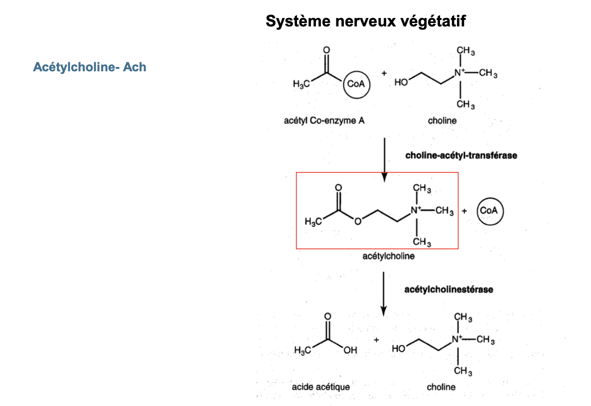 Dans la fente synaptique par acĂ©tylcholinestĂ©rase (AChE) â acide acĂ©tique + choline.