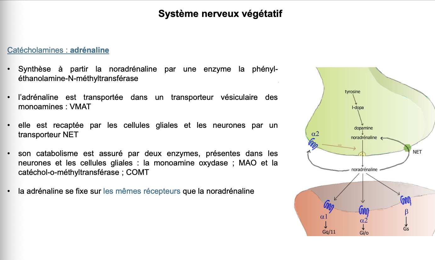 Adrénaline (A) : synthÚse ? transport vésiculaire ? recapture ? catabolisme ? récepteurs ?