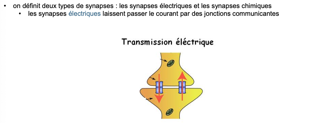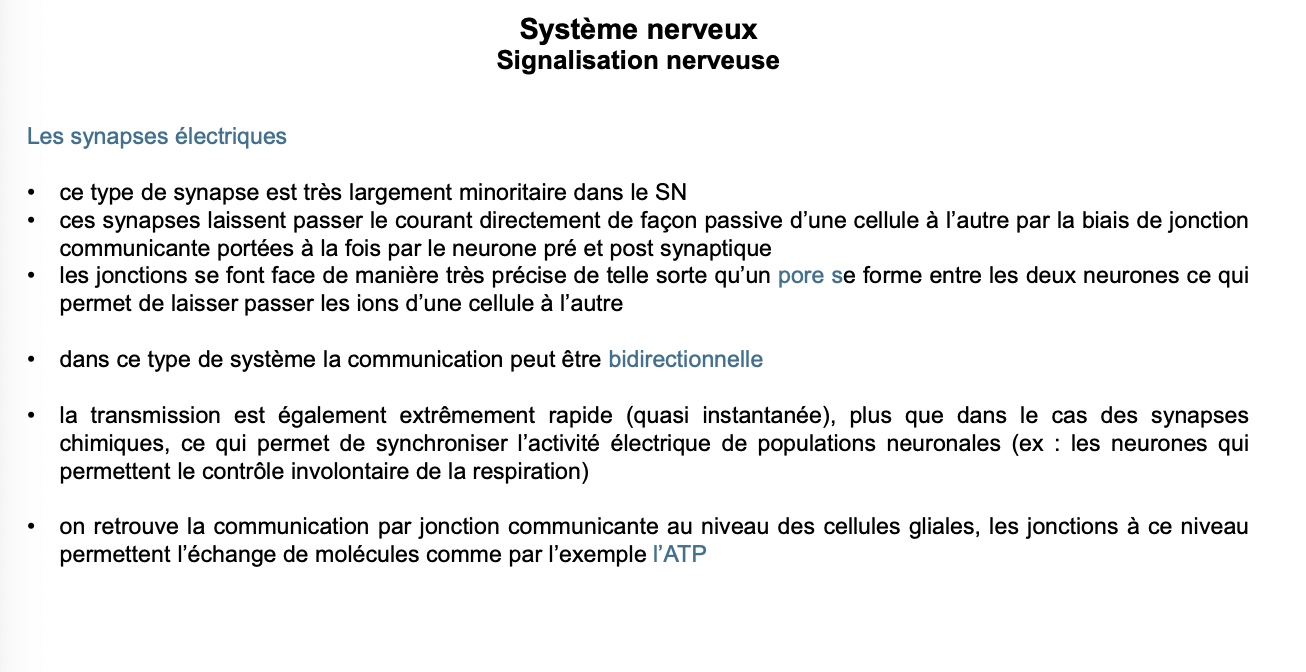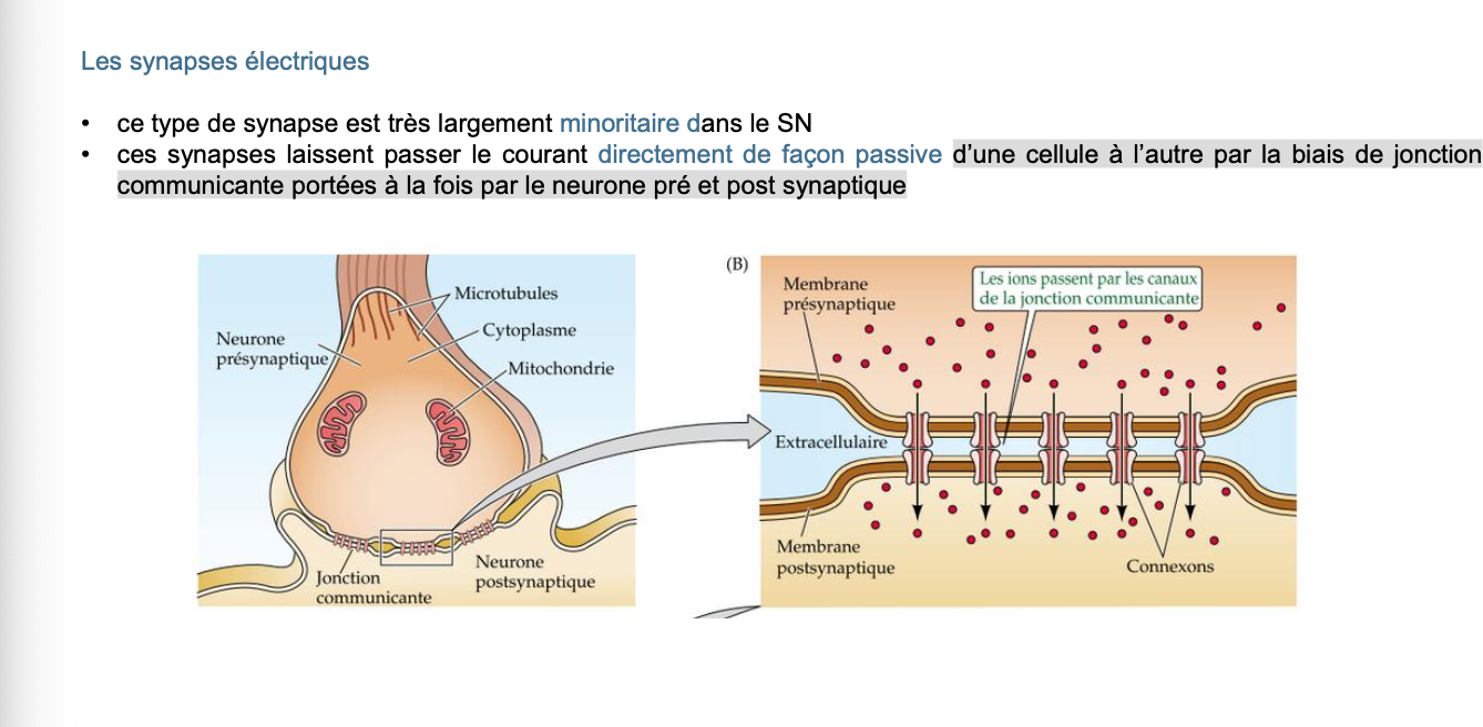 Bilan : synapses électriques = minoritaires, passives via gap junctions, bidirectionnelles (en général) et ultrarapides.