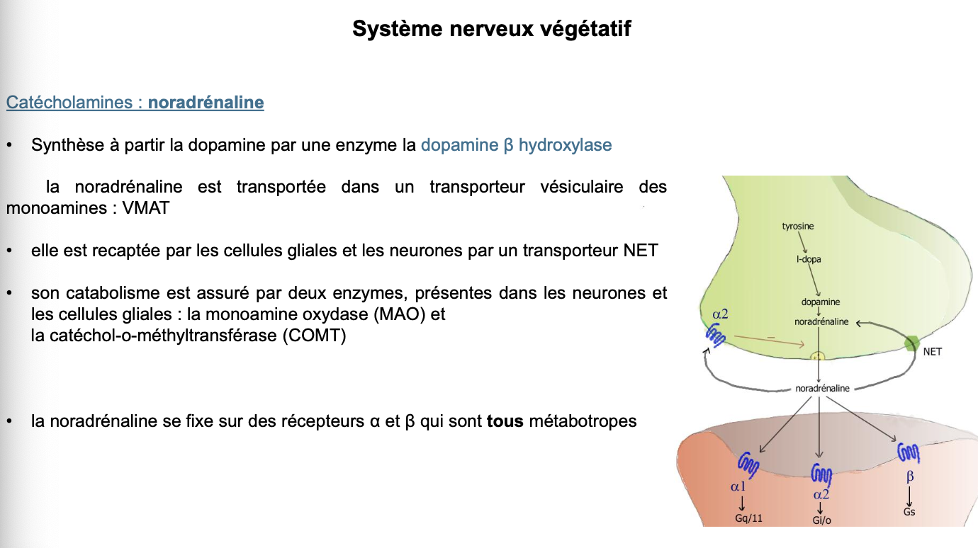 Noradrénaline (NA) : synthÚse ? transport vésiculaire ? recapture ? catabolisme ? récepteurs ?