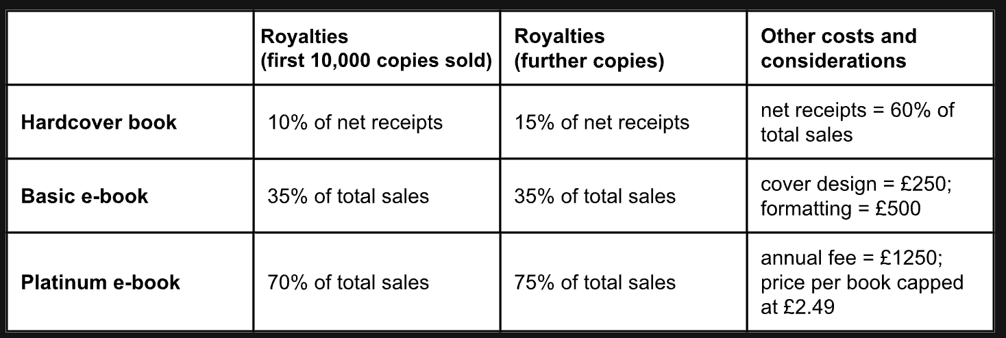 How much more could an author make in royalties in a year by selling 20,000 copies of a basic e-book at £5.49 each, than by selling the same amount of a platinum e-book at top price, after deducting for author fees and costs?