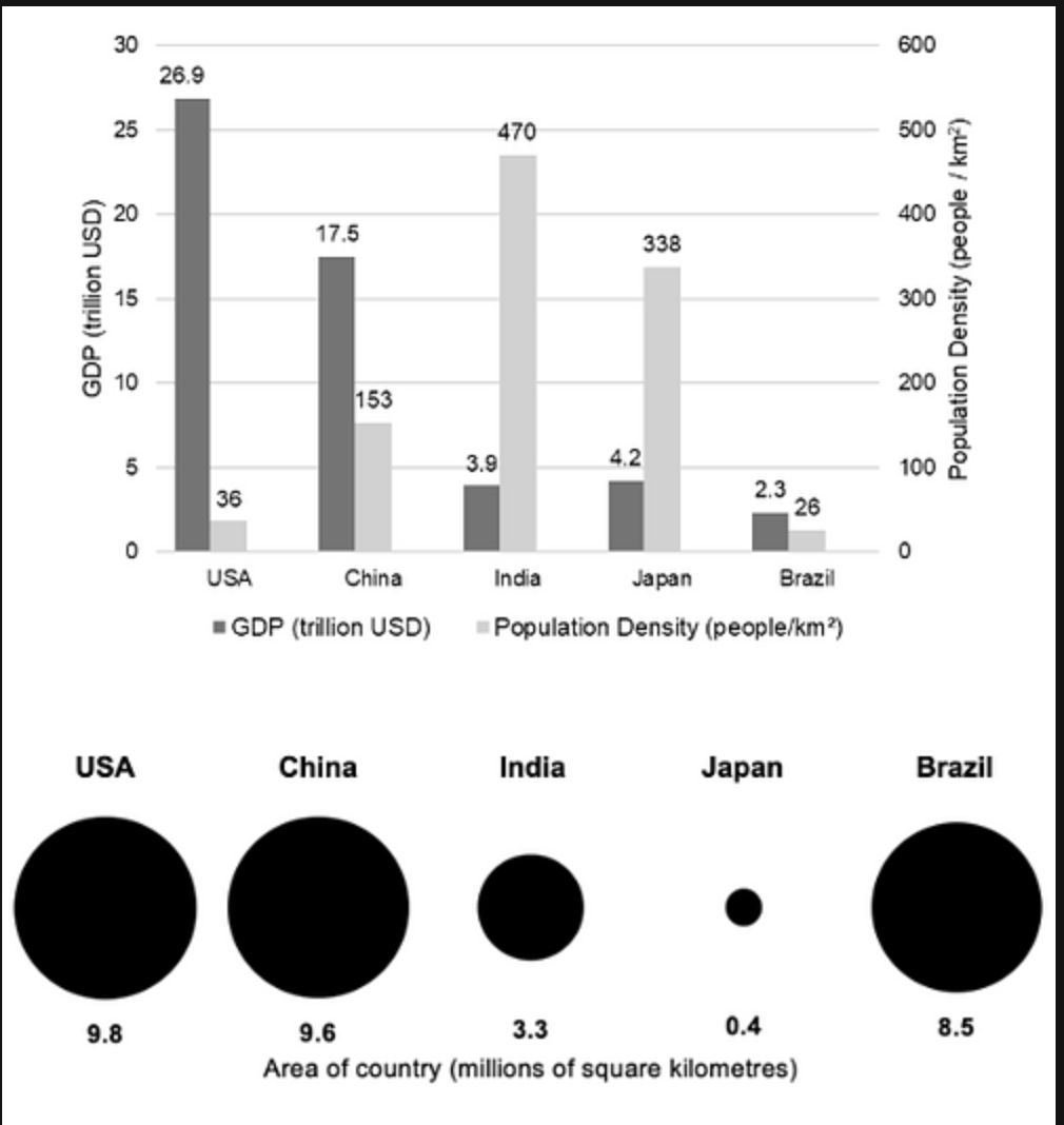 The bar chart below shows the gross domestic product (GDP) and population density of five countries. The bubble chart shows each country's land area in millions of square kilometres.