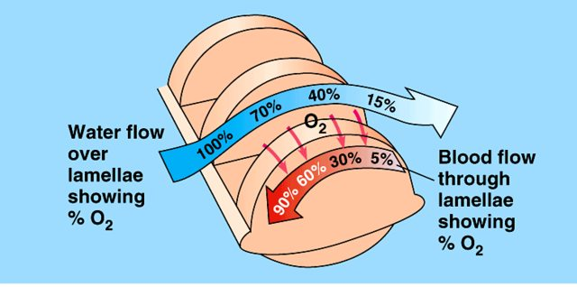 blood in gill plates / lamellae flows in the opposite direction to the water (bony fish)