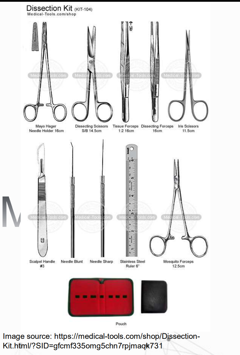 These techniques require basic equipment which include scalpel, forceps, dissecting scissors, flapper, pins, and dissecting pan.
