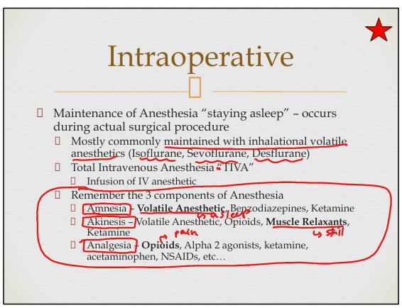 Amnesia(volatine anesthetic>sleep and dont remember) , Akinesia(muscle relaxants-dont move), Analgesia(opiods- limited pain)