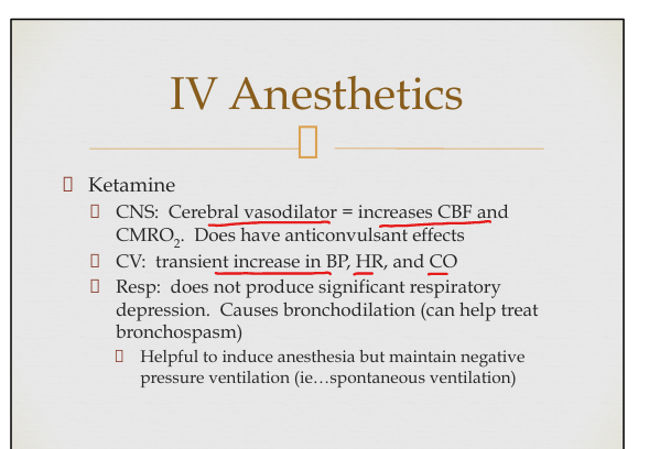Cerebral vasodilator(inc CBF and Cerebral Metabolic Rate of O2) , Profound Analgesia, dissociation, ↑BP/HR/CO, bronchodilation, emergence reactions.