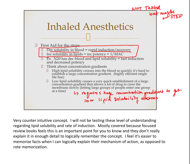 Lower solubility → faster induction/recovery.