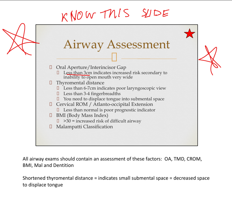 Oral Aperture/Interincisor gap(less than 3cm inc risk to inability to open mouth) Mallampati classification, thyromental distance(shortened=decreased space to dispalce tongue), cervical ROM, BMI(>30 is difficult airway)