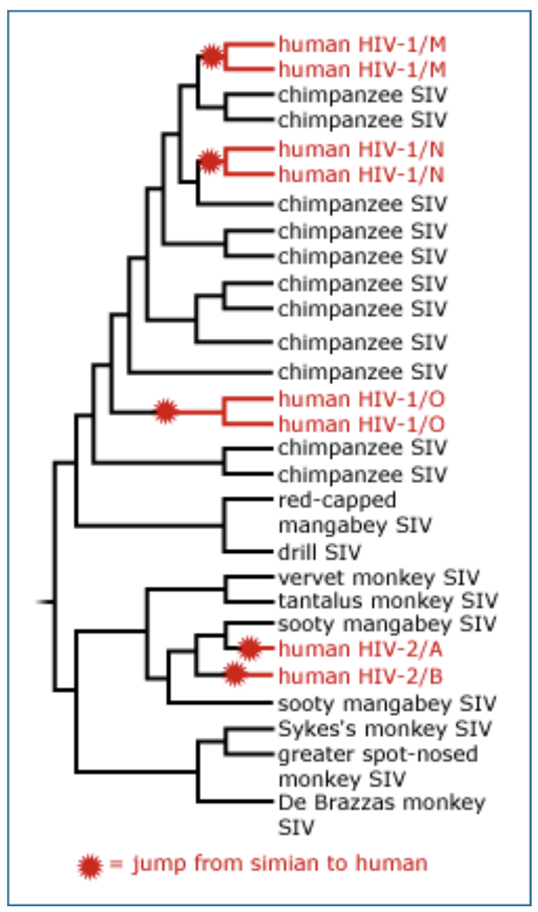 A phylogeny of human and primate sequences shows that the origin of the human virus is polyphyletic, it has many separate origins!