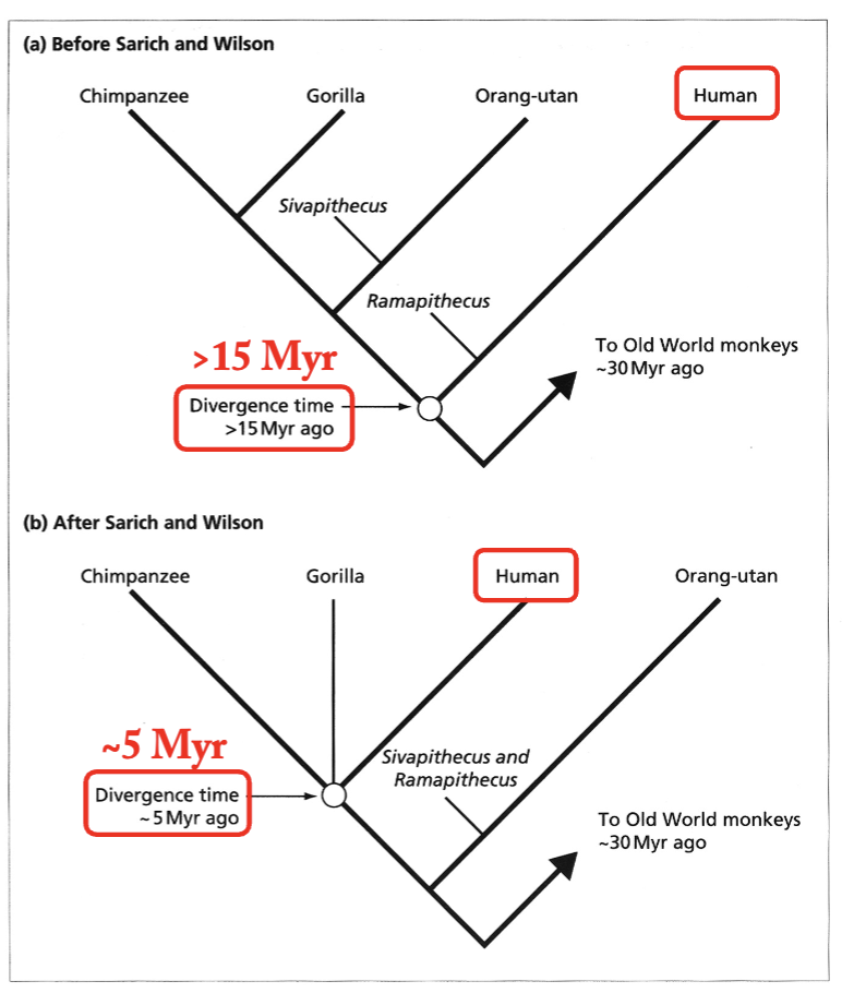 Using an estimated divergence between Homo sapiens and the Old-World Monkeys of 30 myr, they concluded that Homo and Pan (chimps) were (1) sister groups and (2) only diverged 4-5 million years ago