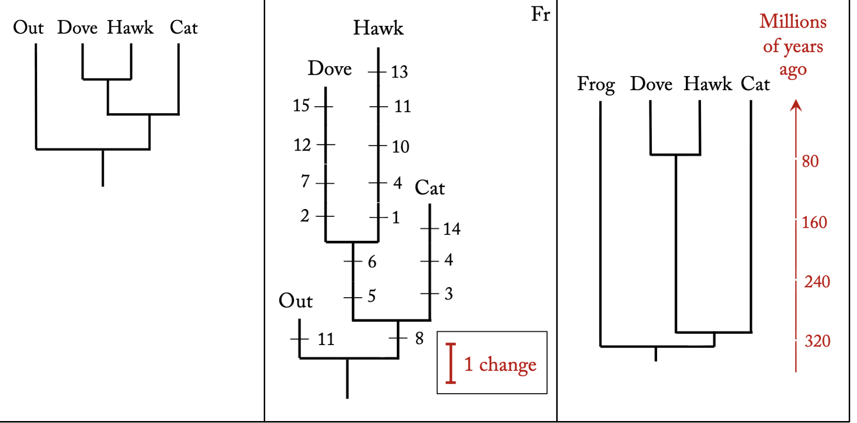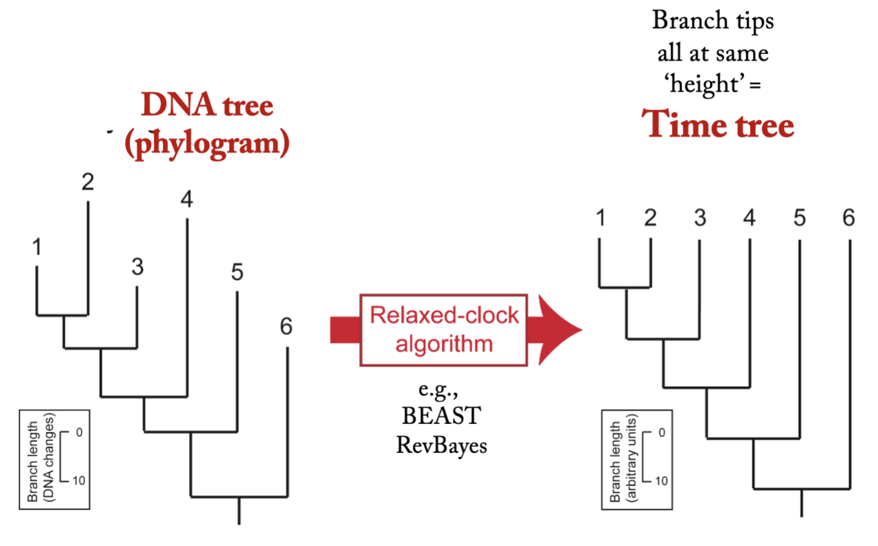 Now we are in a post-molecular-clock era. Rather than assume an average rate of change, we take our phylogram (the cladogram with the branch lengths measured in DNA changes) and ‘rate smooth’ it, to convert it into a phylogeny (also called a timetree or a chronogram; I will not explain how).