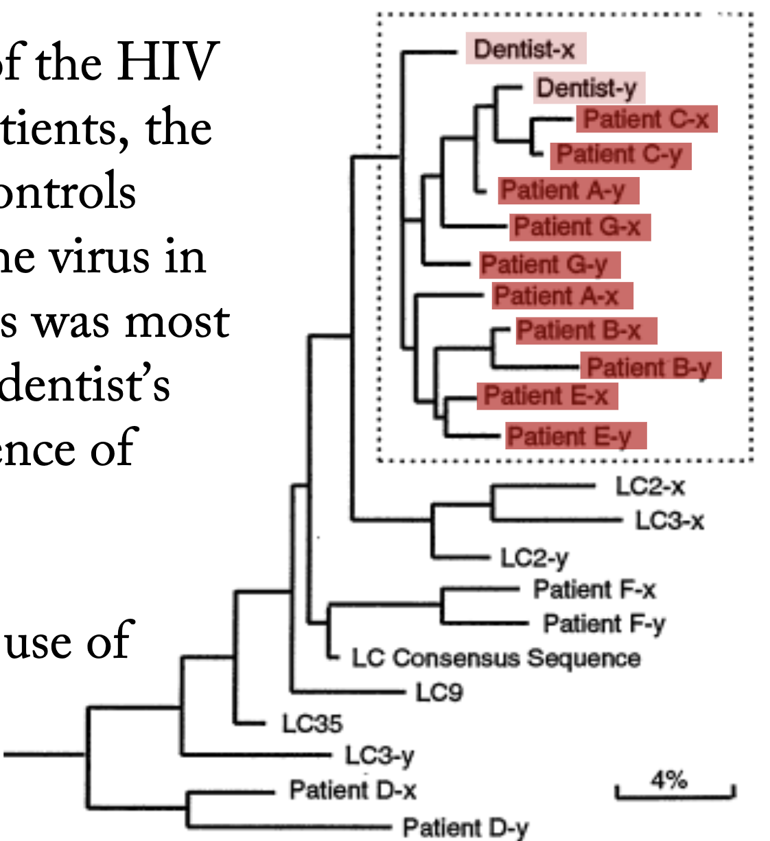 A phylogenetic tree of the HIV sequences of these patients, the dentist, and several controls (LCXs) shows that the virus in some of these patients was most closely related to the dentist’s virus, providing evidence of transmission