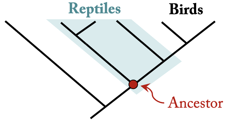 contains an ancestral species and some but not all of its descendants. Reptiles are paraphyletic because they exclude birds.