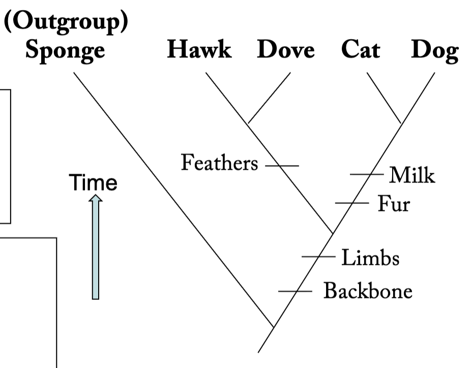 Taxa are grouped based on shared evolutionary innovations, termed synapomorphies (e.g., fur is a synapomorphy of the Cat and Dog).