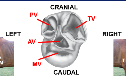 S3: END OF RAPID VENTRICULAR FILLING (Just after S2) = usually seen in fit young horses i.e. only sometimes heard