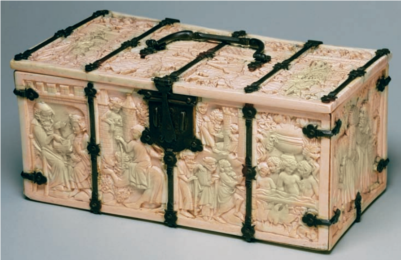 Left Short Side of Chest: Tristan and Iseult At The Fountain; Capture of the Unicorn