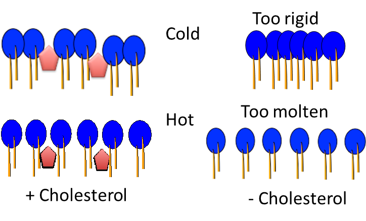 (Can insert cholesterol when membrane is too molten OR too rigid)