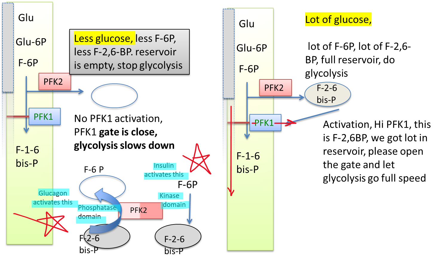 PFK1 activation, Lots of F-2,6-BP in the reservoir, PFK1 gate opens, glycolysis speeds up
