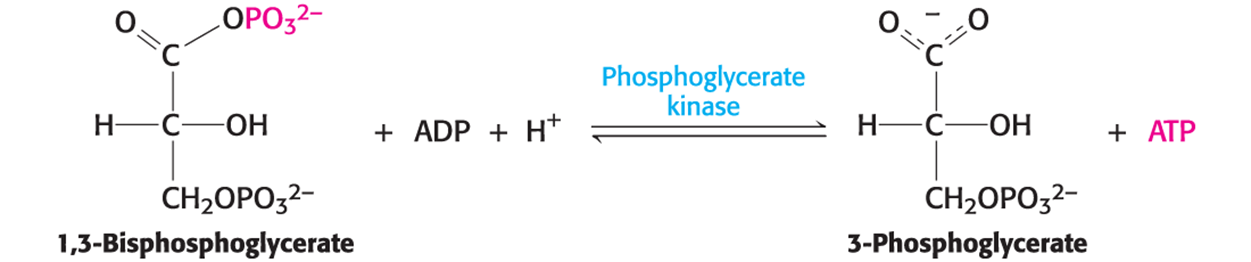 What is it called when one structure has a greater phosphate-transfer potential than ATP and thus can be used to power the synthesis of ATP from ADP and Pi, and is catalyzed by phosphoglycerate kinase?