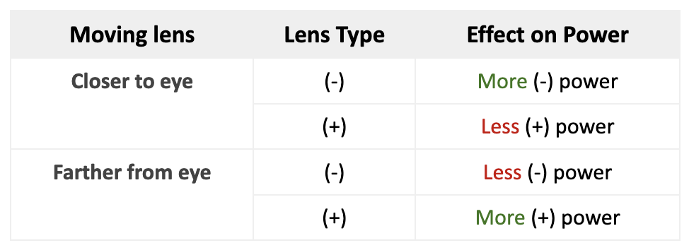 What happens to lens power when a lens is moved closer or farther from the eye?