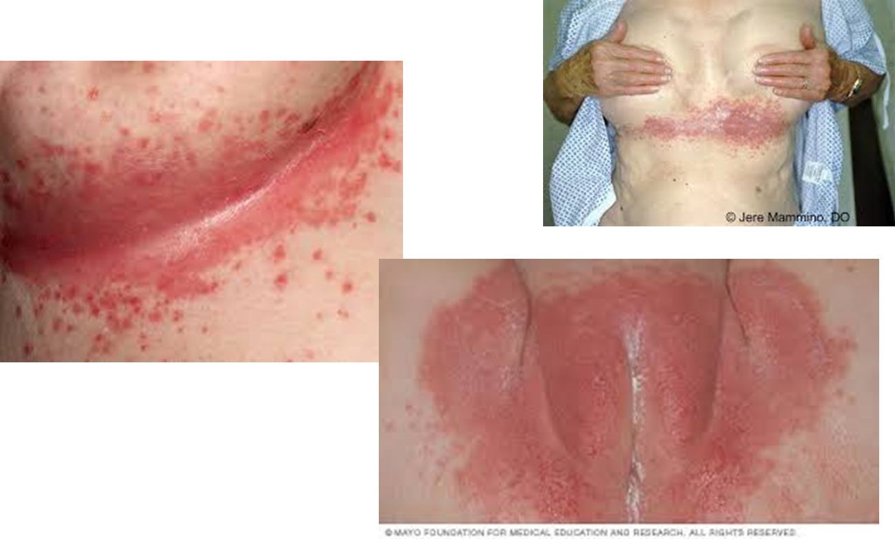 In intertrigo, a rash begins with vesiculopustular (vesicles and pustules), which rupture, causing maceration