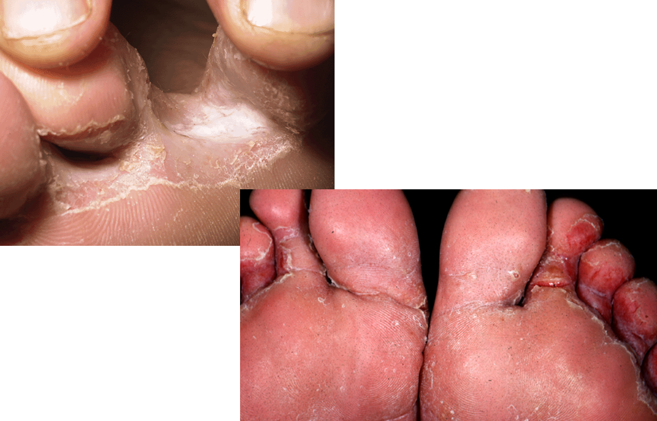Tinea pedis (athlete’s foot) is shown by erythema, scaling, erosions, maceration, and/or bullae