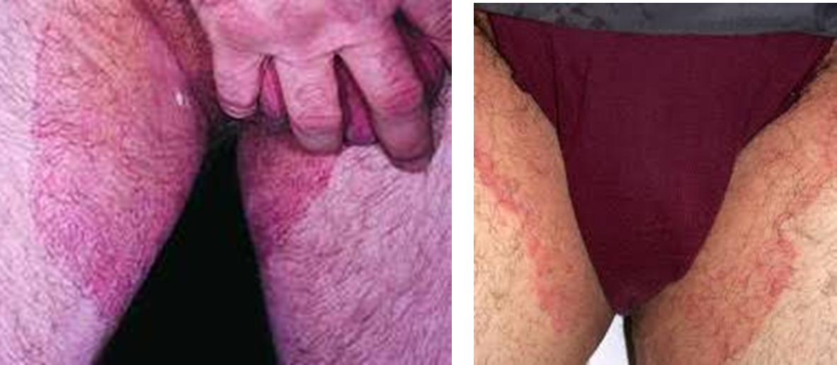 In tinea cruris (jock itch), lesions are large, scaling, well-demarcated, and dull red to brown plaques