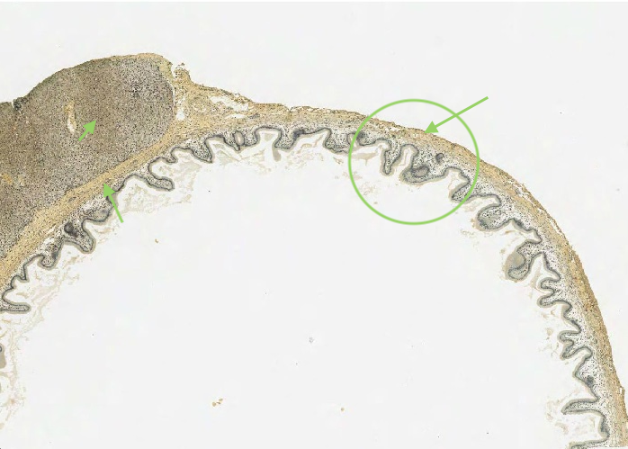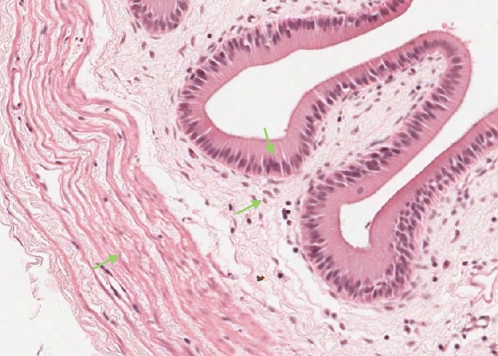 Note the epithelium, simple lamina propria, and subjacent smooth muscle (muscularis externa).