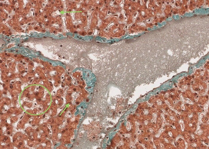 Observe again the parenchyma and the hepatocytes.
