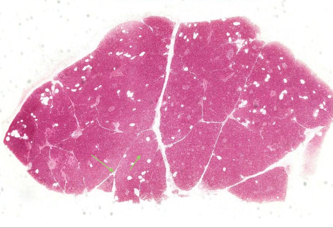 Begin at low magnification by noting that the pancreatic parenchyma has a bright pink/redish color and the connective tissue is seen as predominantly pale lines. Be aware that some purple stained areas are lymphatic tissue. The fairly well defined lobules of the pancreas are separated by interlobular septa of connective tissue.