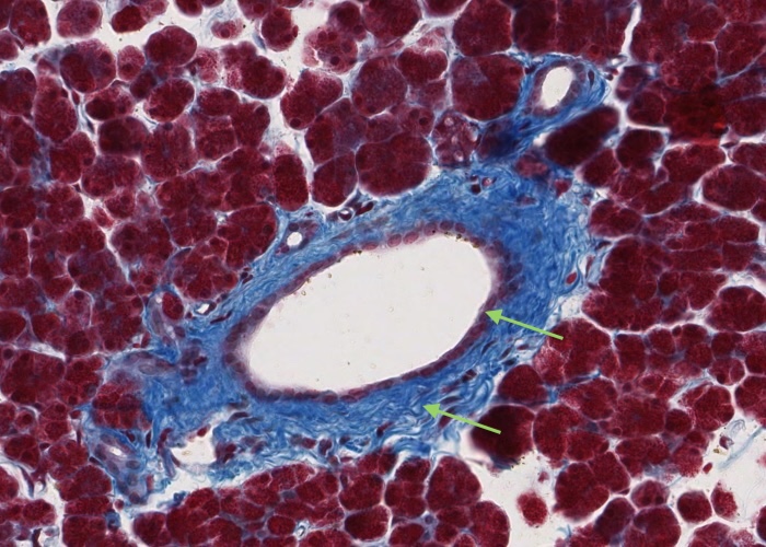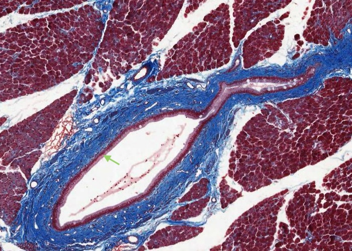 It has little more than a sheet of endothelium (squamous endothelial cells) for its wall, with a minimum of connective tissue (collagen; stained green).