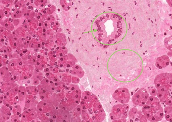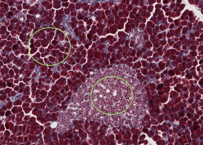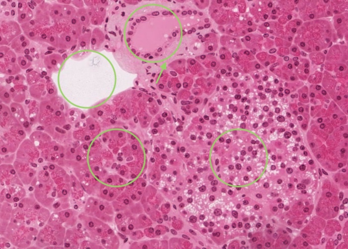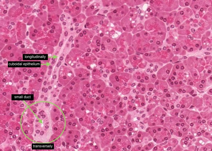 A good exercise is to make sure you don't confuse sections through the pancreatic duct system with sections of blood vessels of various sizes.