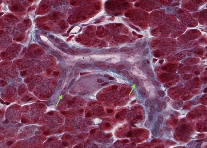 Don't bother searching for an intercalated duct in this section. They are so hard to see and distinguish from small blood capillaries as this section does show the immense vascularity of the pancreas. You will see them clearly in the trichrome stained section.