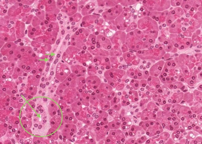 One histological feature worth pointing out (but will be revisisted with the Trichrome stained image) is the centroacinar cell.