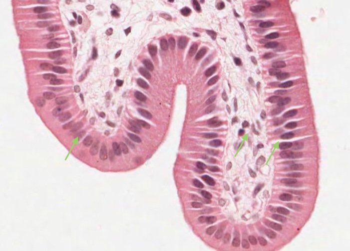The tall columnar cells have microvilli and ultrastructural features typical of an absorptive cell. During active fluid movement from the lumen across to the blood vessels in the underlying connective tissue (lamina propria) a swollen intercellular space is visible with the light microscope.