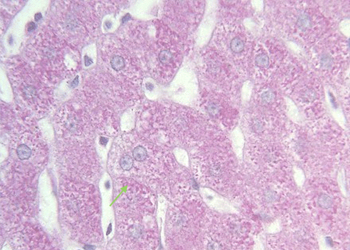 One important role of the liver is carbohydrate metabolism. The liver phosphorylates glucose that it absorbs from the GI tract to glucose-6-phosphate and then this is used in the glycolytic pathways or stored as glycogen. The special PAS stain shows the glycogen staining pink here in the cytoplasm of hepatocytes.