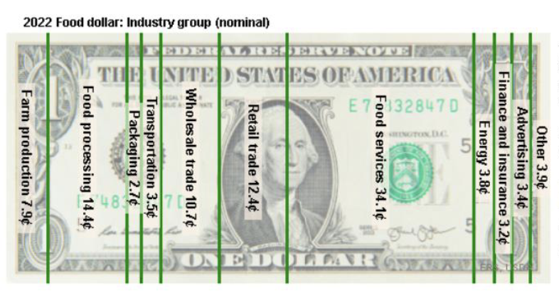 Describe supply chain industries/establishments and their contribution to the food dollar. Rank from greatest contribution to least.