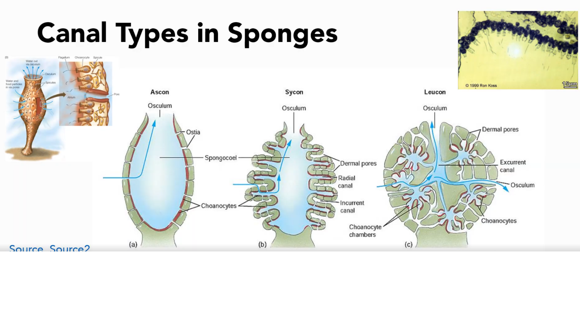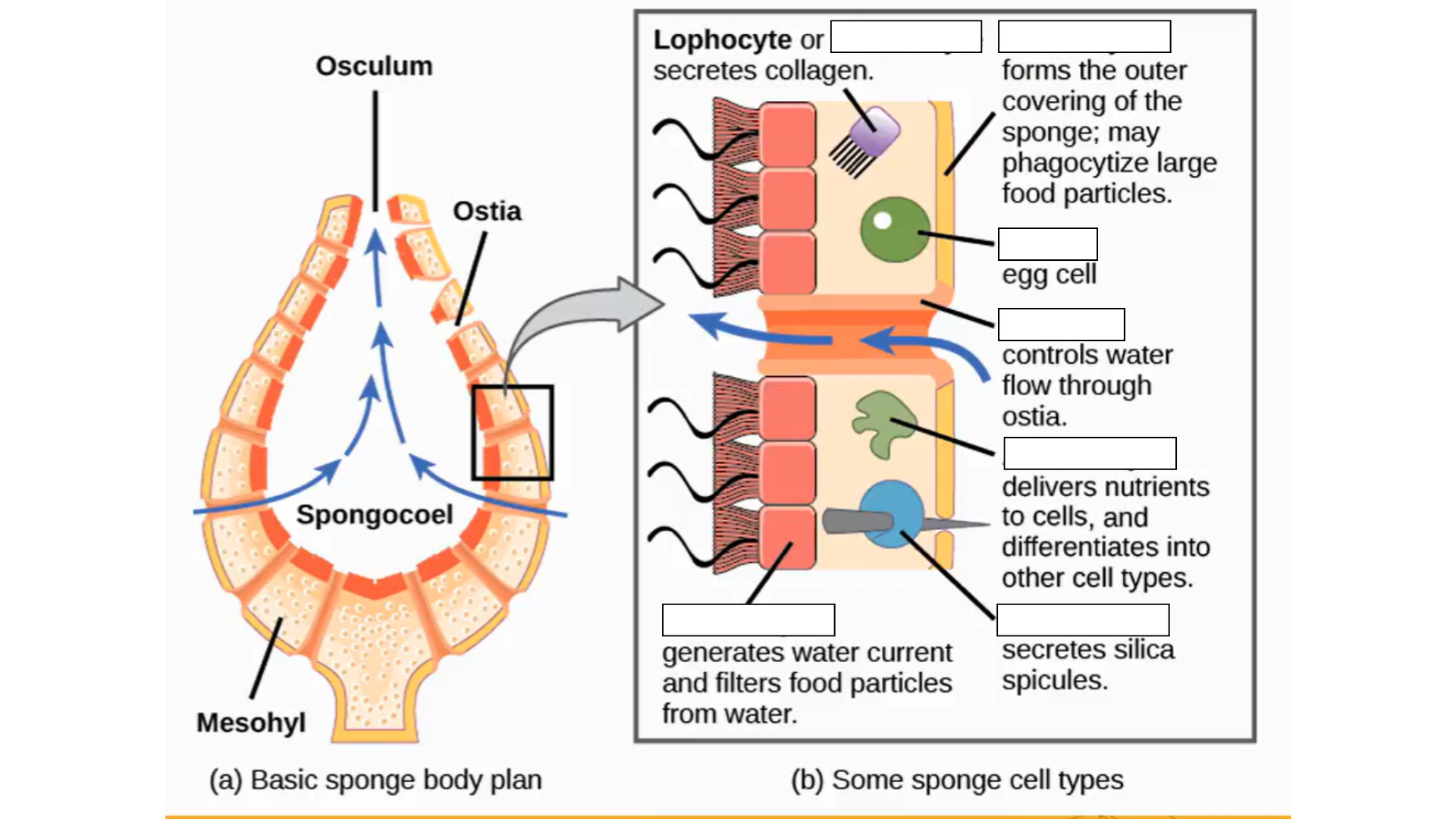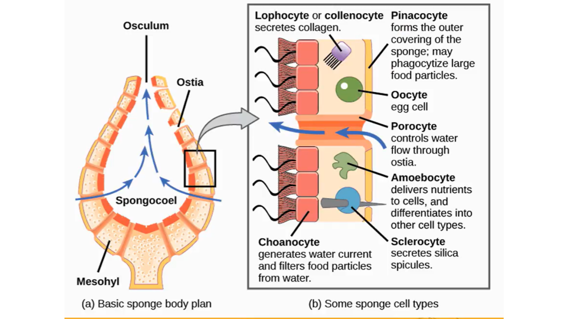 ostia; choanocytes; spongoceol; osculum
